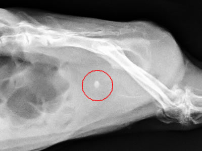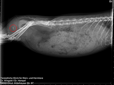 - Röntgenbild eines Meerschweinchens mit einem Blasenstein (im roten Kreis zu sehen)